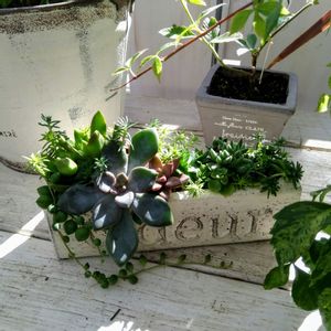 小さめなスクエアポット+多肉植物。細かな葉を持つセダムは寄植えの人気者です♪