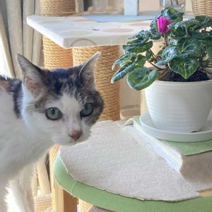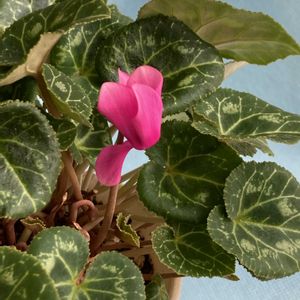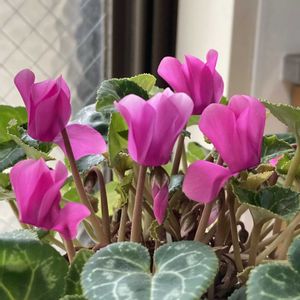 愛猫🐈21歳の誕生日🎂に 今年初のミニシクラメンが ひとつ🌸咲きました*・゜゚・ .。.:*・゜゚・*🐾🌸☘️ 1枚目、間違えてこの前と同じ💦