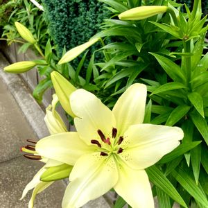 ユリの季節ですねー🥰 カサブランカが咲くまで、いろんなユリが楽しめます💓 ①② スカシユリのレモンライムリリーと テッポウユリ🤍の蕾達 ③はスカシユリのオレンジ🧡