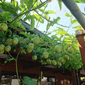 パッションフルーツまだ青い。 この下には、さっき投稿したピンクとクリーム色のバラがひっそりと咲いています。