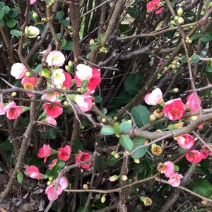 ボケ(木瓜)の花が綺麗に咲いていました。寒木瓜、四季咲きの品種があり、1本の木から違った色合いの花が咲く品種もあります。