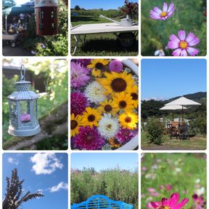 美しき青きドヨウに参加します🎶 昨年、大きな栗の木の下でさんのコスモスシーズンガーデンにお邪魔した時のpis 青空、ベンチの青、お花、花手水などどれも素敵✨✨✨