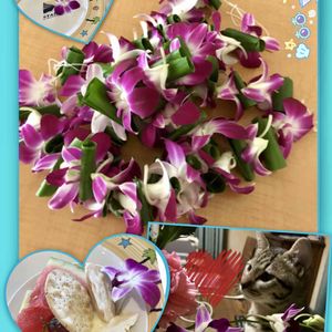 今日のお花 デンファレ 学名.デンドロビウム・ビギバム セッコク属 娘と作ったレイ🏝💕 猫はデンファレよりカーネーションが お好みのようです😻