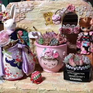 こんばんは、(/^-^(^ ^*)/ 🏷13日14日は葉挿しの日 🏷成人の日 ピンクパンサーさんのモルタル背景ボードに可愛いももりさんのベティチャン鉢の寄せ植え🌱 化粧品空き瓶寄せ植えも一緒に お着物プチブライスchanも🐰さんと一緒で ルンルン💓 今月の葉挿しチャン少し大きく育っているかしら ?