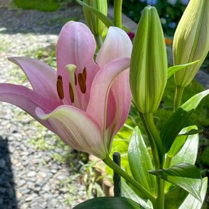 🪴ベランダの花たち その8 八重咲きオリエンタルリリー 長年欲しいと思っていた八重咲きユリ。 八重咲きオリエンタルリリー とか、 ローズリリー とか呼び方は様々。 秋に球根を植えたいと思い 品種を迷ううちにシーズンは過ぎて… を何回も繰り返し、 今回、花苗を見つけました(^_^)v 草丈1mくらい、またはそれ以上になるとかで 我が家のベランダでは少々背丈が高いなぁと 思っていたのですが、 届いた苗は、それほど背丈がなく夏までにどれだけ伸びるのかと言ったところでです。 開花が楽しみ。 一応、風が吹き込むので支柱を立てました。 毎回、思うのは、支柱の立て方。 正確には、支柱と茎の押さえ方とでもいうのでしょうか。 キツくしても良くなさそうですし、 緩すぎても良くなさそうですし…💧 ♬これでいいのかぁー?これでいいのかぁー? 支柱の立て方 よくわからん 風に負けずに 花開け 花好きさんの影響が… ☆*:.。. o(≧▽≦)o .。.:*☆ 🏷金曜日の蕾たち(yuyuさん主宰) ⛅️ *・゜゚・*:.。..。.:*・'💠'・💠* 💠✨:.。. .。.:*・゜゚・* ⌘ メモ ⌘ 🔸科名・属名 ユリ科 ユリ属 🔸英名 Oriental hybrid 🔸別名 ローズリリー バラ咲きユリ 八重咲きユリ 🔸原産地 北半球のアジアを中心にヨーロッパ、北アメリカなど 🔸花期 7月中~下旬 🔸花色 ピンク 白色 黄色 オレンジ 複色 🔸特徴 多年草。球根植物。草丈60~150cm。 日本を原産とするヤマユリやカノコユリなどの、 森林のユリを交配して作られた品種群を指す。 代表品種は「カサブランカ」。香しく華麗な大輪の 花は見ごたえがあり、鉢植え、アレンジメント、 ウエディングのブーケなどに人気。 葉は互生する披針形。 茎頂に総状花序を作り、雄蕊・雌蕊が花弁に変化し 幾重にも重なり合うように咲く。雄蕊だけが花弁化 したもの、雄蕊・雌蕊の両方が花弁化した園芸品種 もあり、花弁は12枚〜36枚。花弁は反り返る。 花径10~20cm。