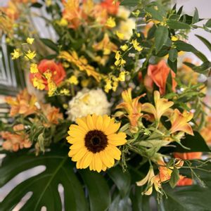 こんにちは😊 グランドオープンの商業施設の💐スタンド花💐 ひまわり🌻 オンシジューム アルストロメリア バラ アジサイ モンステラ🌿 🌾スモークグラス🌾 アメリカ🇺🇸原産 イネ科の植物🌾 アレンジメントや 花束💐の名脇役 切り花やドライフラワー として利用される