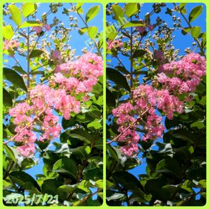 2025年7月21日撮影 横浜市内 散歩で出会えたお花達。 咲き始めたピンク色サルスベリ (左側)明暗色彩編集 (右側)元の色合 🟩🟩