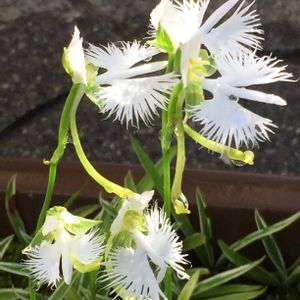 大輪のサギソウ・玉竜花。 三重県で発見された4倍体のサギソウで、通常のサギソウよりも全体的に大きくなる品種です。 花は大きいもので直径5cmほどにもなり、唇弁の切れ込みが深く羽根のヒラヒラが長い感じなので少し横長の花型になりますね。 葉茎も長く草丈は大きいもので40cmほどになり、濃緑色の長い葉を雄大に広げます。 サギソウの品種としてはわりとメジャーな品種で、以前から大量に出回っている無銘の大輪系統も姿形からしてこれと同じものではないかと思うのですが、どうでしょうか。 やはり花が大きいので非常に見栄えがよく、草丈も高いのでかなり目立ちますね。 しかし寄せ植えにすると目立ちすぎてしまってイマイチ協調性に欠けると言いますか、サギソウならではの可憐さは少し失われ気味かもしれません。 かと言って単体だと長く伸びる葉が少々だらしなく見えてしまい、なかなか納得のいく仕立て方が思い付かないのが困り物です。 花自体は文句無しの美しさなので、大輪の性質を残しつつ草丈を抑えるような方法があれば良いんですけどね〜 ってか、いくら大輪大輪言っても写真じゃ全然わかんないですよね。スイマセン。