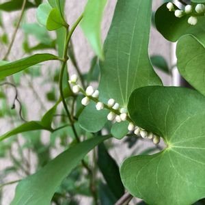 ヤマノイモ 雌雄異株 雌雄異花 この花は雄花 ① よく見ると、三菱のマークのような小さな口を開いて。これで満開かな。 今年の狭庭は、ヤマノイモがあちこちに。 ツルが至る所で垂れ下がって。 雌花は見えない。 ヤマノイモの雌花は2024/0802 に投稿してる。 興味ある方は覗いてね。
