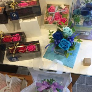 プリザーブドの花屋にて。赤だけでなく貴重な青もある。家内は7年前買ったプリザーブドの薔薇の置物の交換に来た。薔薇の美しさは永遠に留め置きたいのは分かるが…。