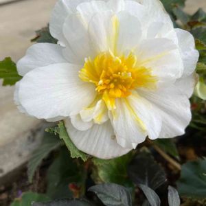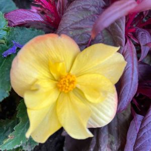 エラチオールベゴニア♡ 仕事先の駅の植え込みにて。 観賞用トウガラシや、ケイトウの 赤紫の葉っぱの中でこの黄色が よく映えます😊