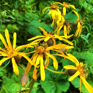 7/18 草むらの中に「メタカラコウ」😊 まだ花が開き始めたばかりでショボショボですね。 この仲間もよく似てて、オタカラコウの方がどちらかというと高いとこにあるはずなんだけど、茎葉がイヌドウナのように基部が広がって茎を抱くところが、これは鞘状になって茎を抱いているので、「メタカラコウ」でいいかな…と😍