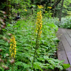 湿原縁を通る木道の山側に居た、背伸びしたメタカラコウやシュロソウ。 地味なチョコレート色のシュロソウの花が、陽に透けて艶やかな紅色に輝いていました。