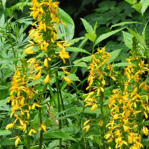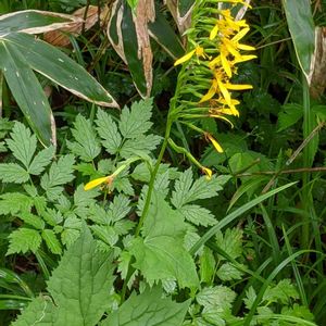 メタカラコウ(雌宝香) *キク科メタカラコウ属 花期は6〜9月 本州〜九州の山地や亜高山の湿った草地や林内の湿った場所で見られる。 草丈は60〜100cm フキに似た根生葉から花茎を伸ばし 黄色い頭花は舌状花が1〜3個と筒状花から! 下から咲き上がります! 良く似たオタカラコウの舌状花は5〜9個 名は オタカラコウ(雄宝香)に比べて小さく 優しい感じに見える事から! 岩手県一関市