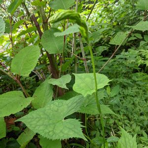 ヨブスマソウ(夜襖草)か、と思いましたが、ヨブスマソウは、葉柄に翼があるそうです。この葉には翼がありません。 メタカラコウ(雌宝草)と解りました。 富士見台車道にて