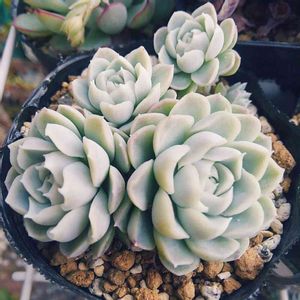 ★ヒューミリス 最強寒波手強いですね〜💦 我が家のおっぱいペンデンスがぁあああ‼️ 一部ジュレっておりました😱 本日はヒューミリス。 この子も呼び方、読み方色々あります。 ホウミリスだったりフミリスだったり。 ヒューミリスなら「Hughmillus」ですが、 和名で月影の宵が当てられています。 月影の宵は月影(エレガンス)の園芸種で、 月影よりも葉色が明るいのが特徴とされています。 つまりエレガンスの選抜種と同義なわけです😅 もちろんアルバも類似種ということになります。 アルバは通年緑ですけど…。 え、結局エレガンスなわけ? ってことですよね?(笑) ここで話が終われば良かったんですが、 純粋なエレガンスとの戻し交配も行われており、 多少の顔違いが存在することも確かです💦 なのでここでは、 エレガンス交配種の一型としておきます😆 ちなみに、 Echeveria humilisでも紹介されてたりしますが、 正しく書くならEcheveria "Humilis"です。 humilisというのは細葉の原種がすでに存在します。 大文字小文字で意味が違うんですよ😅 余談ですが、 見かける度に疑問に思う品種があります。 それは「アルバホワイトローズ」 元々アルバには白いという意味があります。 そこにホワイトって足したら… 違和感たっぷりな変なダブルネームです💦 いかに安直でいい加減なネーミングか… 名前って後世まで残るわけなのでとても大事です✨ 生産、販売される側の方には、 思いつきだけで名前を付けないで欲しいなぁ…😑 -∴-∵-∴-∵-∴-∵-∴-∵-∴-∵-∴- Echeveria 'Hughmillus' エケベリア 'ヒューミリス' 和名 白月影(シロツキカゲ) 別名 フミリス ホウミリス ヒュミルス ヒューミリス シノニム Echeveria 'Humilis' Echeveria elegans 'Humilis' Echeveria elegans 'Hughmillus' ※和名はアルバと同じものです