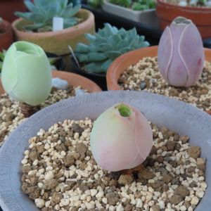 台風で避難中の卵たち。アエオニウムの中でも画像のように夏には全体が閉じてしまうのもあれば,開いたまま葉がギュッと密集してくるのもある。 手前のロイヤルパルマSPの色が,後ろのエッグ(緑)とパンドラローズ(紫)の中間のような色なのが不思議な感じ。