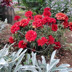今庭のクリスマスカラーゾーン ①マリーゴールド ストロベリーブロンド ②マウントオビスク いや、夏花、秋花だし😅 寒風を浴びてコーラルカラーの花が深紅になって頑張ってます