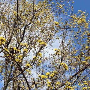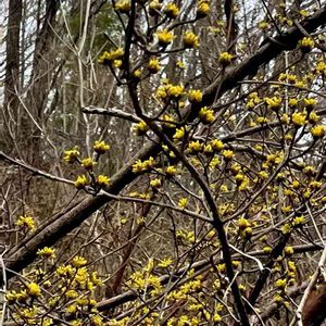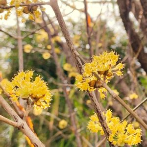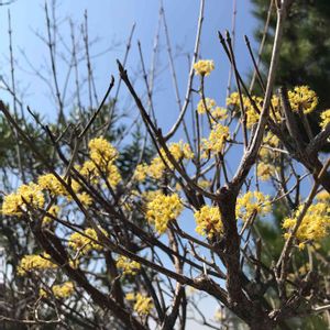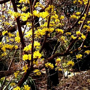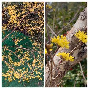 暖かかった昨日 初めて出会ったサンシュユ 大きな木のわりに一本一本の枝は細く ポンポンと弾けるように花が咲いていました💛