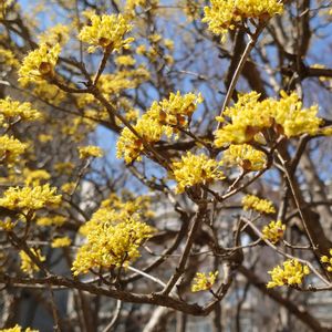 近所の親水公園で 咲き始めた山茱萸。横にアブラチャンもいました。次は陽に照らされて 赤い樹皮に会えたらいいね。