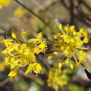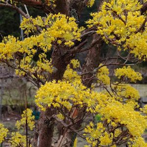 《ダンディ果樹園に初春に咲いていた》 ミズキ科ミズキ属の落葉小高木。中国原産で、春先に葉が出る前に黄色い花を咲かせ、秋にグミに似た赤い実をつける。別名でハルコガネバナ、アキサンゴ、ヤマグミとも呼ばれる。季語は春。 「君の名は」