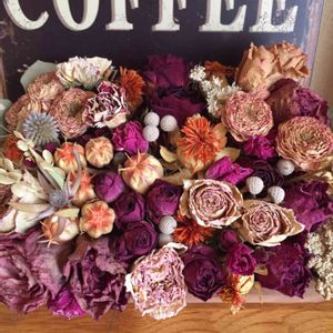 シワシワ祭り🎶 作り貯めたバラのドライ🌹 チマチマと箱に寄せてみました どうでしょうか😄 み〜〜んなシワシワだよ( •ॢ◡︎-ॢ)-❤️