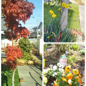 赤く色づいた紅葉、その葉が落ちだすと、その根元から出てきた水仙の芽、やがて黄色い可愛い花が咲く。季節の移り変わりが、わたしを楽しませてくれます🎵小人の楽しむ花壇ではパンジー達が、楽しい会話☺️我が家の庭はにぎやかです💕