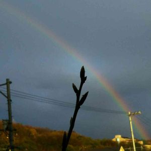 17時20分 虹🌈が出た❕ わが家から見える山をまたぐように、虹が出てます🎵 次男が小学生の頃にどんぐりを植え、今年も芽吹いてくれそうです❗