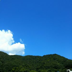 14時、ベランダから見た空 この山から☀ 🌕が出ます! 今日は晴天💦 陽ざしが眩しく暑いです💦
