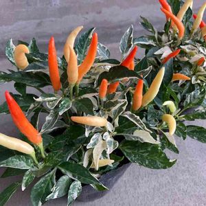 ●。カラフルな実が魅力的です。● ゴシキトウガラシ レッド&ホワイト 鮮やかな実と斑入り葉がおしゃれな 観賞用トウガラシです! 暑さに強く、夏でも元気よく育ちます🌞 日当りと風通しが良い場所で育ててください🌱 夏の花壇の彩りや、寄せ植えの差し色におすすめです♪