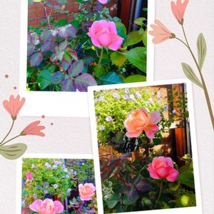 薔薇タペストリーとハンキングの共演 PWスーパートレニアと一緒に記念撮影🍀 薔薇タペストリーのアンティークカラーが魅力的で何枚も撮影してしまいコラージュしてしました😅同じ様な写真ですみません🙇
