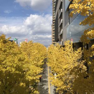グラングリーン大阪へ向かう途中、道路沿いの「イチョウ」並木をパチリ!📸💛😊😄🏙️🌞✌️ 今日も調いました。♨️🧖🍺🎶👌