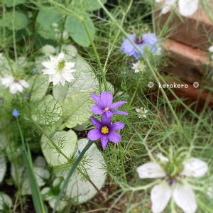 ①②シシリンチウム ムーディブルース 背丈10~15cmと思ってたら、 こんなにスラッとさんになりました。 カリフォルニアスカイと間違えて買ったみたいです。 ③ムーディブルースを植えた時に 隣の花壇にそっくりな葉っぱが出てきたので 抜かずに育ててみたらお花が咲くようになりました。(ルリニワゼキショウかな?) ④ウッドデッキの下を覗いたら こんな葉っぱも育ってました。 かっこいいギザギザ(多分キレハノブドウ)と 丸い葉っぱ(これは何でしょう?) 抜かずに置いといてみます。