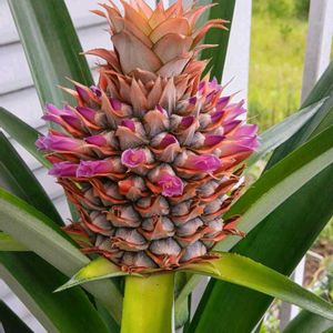 デザートで食べたパイナップルのクラウン挿しです🍍 5年目にして、やっと実を結び、花が咲きました‼️ 赤紫で、とっても綺麗なんですが、 どうやら、今回も実が小さいようです😅 諦めていたので、栄養不足だったかな😢 もっと手をかければ良かったです🙏