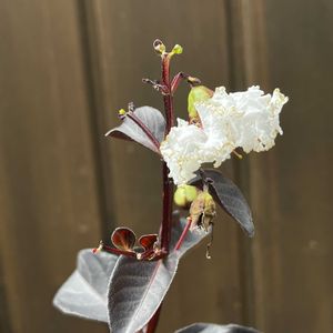 カラス葉サルスベリ 木が小さくても花が咲いてます💕 白い花のカラス葉サルスベリをずっと探してても、なかなか会えず、盆栽コーナーで30cmほどのかわいらしい子を見つけたのでお迎えしました😊