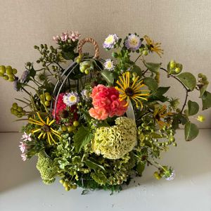 おはようございます☺️ 8月のフラワーアレンジメントレッスンは、鳥かごの花器のアレンジでした💐 自由作品 ①②③作品の出来上がり ④まずは鉢植えのアジサイを2節目から切って入れました💠 それから、一つ一つバランスを考えながら入れていきました❣️ ⑤花材は アジサイ 鉢植え 霧島の恵み ブバリア ピンクの小花 ケイトウ ピーチとグリーン ユーバトリウム ラベンダー ルドベキア ヘンリーアイラーズ 細い花びら、珍しい花 アスター ココットスカイ スターチス 黄色 セダム サンキライ グリーンの実 バラの実 チョウジソウ ケイトウの2色の色がアクセントになって、それぞれの花が自由な感じに出来上がりました💐 アジサイの鉢植えは、剪定したので 鉢増しして、明るい日陰に置いて育てたら、また来年も花が咲くと教えてもらったので、帰ってから鉢を植え替えしました🤗 鉢植えごとアレンジにしたのははじめてでした❣️ 今回も珍しい花材と花器を準備してくださった先生に感謝でした💕 次回も自由作品にしました *花日記より*💐 🏷️愛の花♡ 🏷️ありがとうの花❣️ 🏷️花咲く乙女たち♡