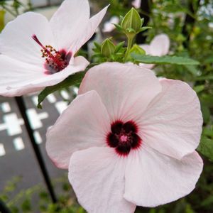 高砂芙蓉(タカサゴフヨウ) 別名 ヤノネボンテンカ 前と 後ろ姿も見て下さい。 フヨウに比べて小さいのでミニフヨウと呼ばれています。 花弁は5枚で花弁の基部が赤黒くなっている。花を裏側から見ると赤いストラップが何本も入っている為全体が薄いピンク色に見えます。