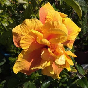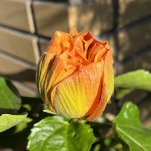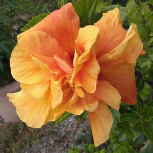 こんにちは😊 冷えて来ました😷💦 夏から何度も登場の 🧡八重咲ハイビスカス フルムーン🧡 2個一緒に咲いてくれるのは 今年はこれでお終いかな😥 3枚ご覧下さいネ🙏 7月から玄関先を明るく華やかに してくれて ありがとう🥰♥️