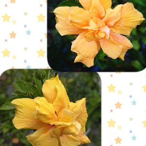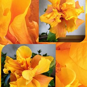 こんにちは😊 久しぶりに咲いてくれた 💛ハイビスカス フルムーン💛 これまでに咲いたお花より とても大きいです🤗🎶 1個だけですが朝と午後の色合いが 違ってて どちらも選べなかったので コラージュしました🥰 上は午後、下は朝 撮りました🤳🏽