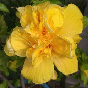おはようございます😊 昨日蕾だった 💛ハイビスカス フルムーン💛 昨日蕾で投稿してるお花が 今朝咲きました🥰 八重咲のハイビスカスは初めてで とても嬉しい(#^.^#)♥️ 6月にバースデープレゼントとして 知人にいただきました😊 環境が変わってか?10個くらい 蕾が咲かずに落ちました😭 今日からは元気に咲き続けて くれそうです🎶💕🎶💕