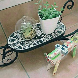 玄関(日光あまり入らない⤵)に置いてる花台。 冬場はシクラメンとかビオラを置きますが、いまの時期花を置くの可哀想なので、多肉や観葉植物を交代で置いてます。 コチレドン ペンデンス ドームのはフェイクですゴメンナサイ あと娘が図工で作ったネズミ🐭