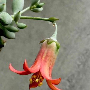 過去に撮影した画像になりますが、コチレドン・ペンデンスの花。 梅雨入り前にカット苗を3株挿して根付くのを待っていたら、1株だけ花芽が付いて開花しました。 多肉植物を育て始めて浅い中での初開花は感動モノでした。 しかし、多肉植物は開花するのが物凄く遅くてじれったくなりますね(;^_^A