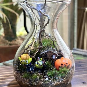 みなさんこんばんは😃 夜分遅くにすみません🙇 本日、家の奥さんの友達から沢山の瓶を貰いました❗️ その瓶🫙は口は小さくちょっと変わってたのでこれを使って苔テラリウムを作る事にしました😅 下から見ると底の中央部が抉れていて中は山の様になってます❗️ 中に土を入れる時 山の真ん中が埋まらない様に入れヒノキゴケを中心に向けて植えていき完成させました😎 完成後に瓶の底からライトを当てると瓶の中の苔が光、幻想的とは言いませんが いい感じになってました👍 完成ご