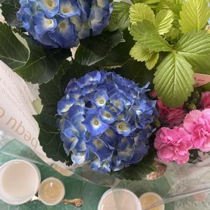 とっても 素敵な💓 プレゼント 先ほど 娘夫婦から 届きました アジサイ と ミニカーネーション と ワイルド ストロベリー の バスケット入り です 美味しいプリンも