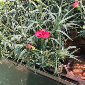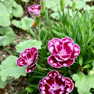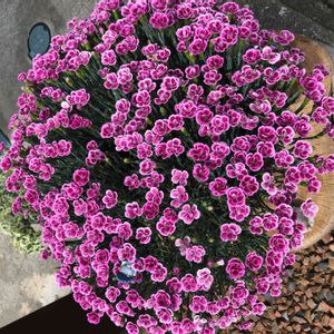 濃いピンクとピンクに濃いピンクの花芯のミニカーネーションの寄せ植えです☺️ ミニバラは白でスッキリと、カリブラコアはステキなあわいムラサキで大人チックに🌿 後は、オレガノ マルゲリータを株分けして入れ、同色のロータスブリムストーン、前方にラミウムを入れました😀