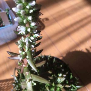 ダイソー産 クラッスラ属ポイポイプランターで、紅葉祭り?秋葉の火祭り? の花が咲きました‼️ 小さな白い花❣️ これからの紅葉も楽しみにしてます。
