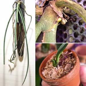 ラブケンシス🌱 . 仕立て直した😑 網を丁寧に切って板に着けたんだけど、 根元の網側にちっこい子株が出てたのをポロリ😭 . 根っこが気持ち付いてたから、 右下、植えて見た🙄 なんの変化ナシ🙄 . 右上、根っこと多分花芽😆 ゆっくりだけど伸びてきてる😳 . LEDの側に移動😊 . 咲いて欲しいと心から思う😆