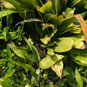 ハラン 葉蘭です バランとも言います 日向で育ててるので、日焼けして、破れてます お弁当にハランを使えば、ちょっとオシャレな気がしますが、うちのは使う気がしません 本来日陰で育てるらしいですが、株が大きくなりすぎて、大きなシャベルでも掘り起こすことができません