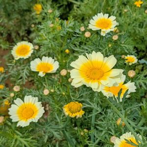 野菜とは思えない可愛さ 「春菊」 たまたま、買い物先の向かい(畑)に 咲く姿が見えて、急遽撮影会でした🌼 黄色単色も咲いてましたが、私には グラデーションありの春菊の花が💛 キク科一年草の野菜として記載。 花言葉は「とっておき」らしいです✨