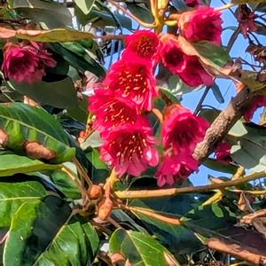 今朝、お散歩で濃ピンクの木花を 見つけて…ググってみました❗️ 初めましての花でした💘(ӦvӦ。) 🔰ロドレイア 花言葉「幸福の再来」「古き伝統」「無事を祈ります」だそうです。 【花の特徴】 シャクナゲのような花を咲かせる 葉は硬く光沢があり、下を向いて咲く 原産地は中国南部もしくは東南アジアとの記述もありました。 和名は「シャクナゲモドキ」 英名では「ホンコンローズ」 ※〇〇モドキは可愛そうなので、「ロドレイア」で記憶に留め置きたいと思いました😊